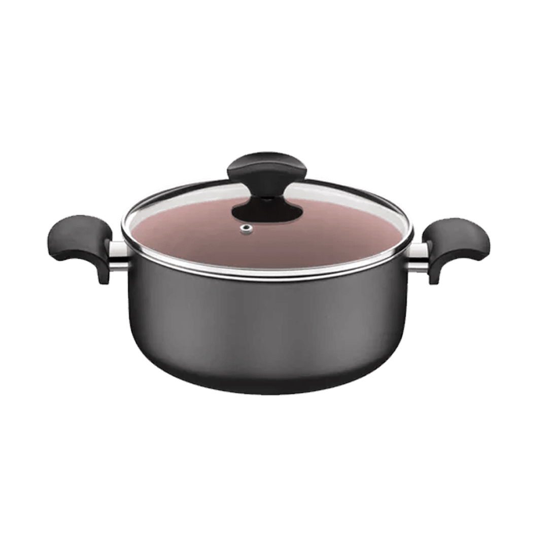 Cacerola de aluminio con revestimiento interno y externo Starflon T1, con tapa de vidro templado con borde de acero inoxidable y salida de vapor.
