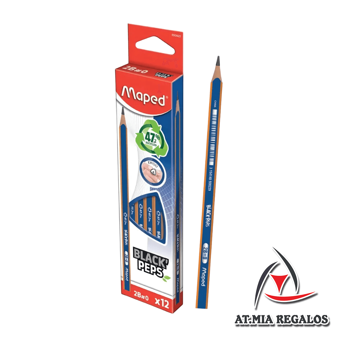 Caja de 12 lápices negro grafito, cuerpo triangular adaptable a la mano, mina resistente. Estos lápices de la reconocida marca Maped son ideales para artistas y estudiantes que buscan calidad y durabilidad en sus herramientas de dibujo.