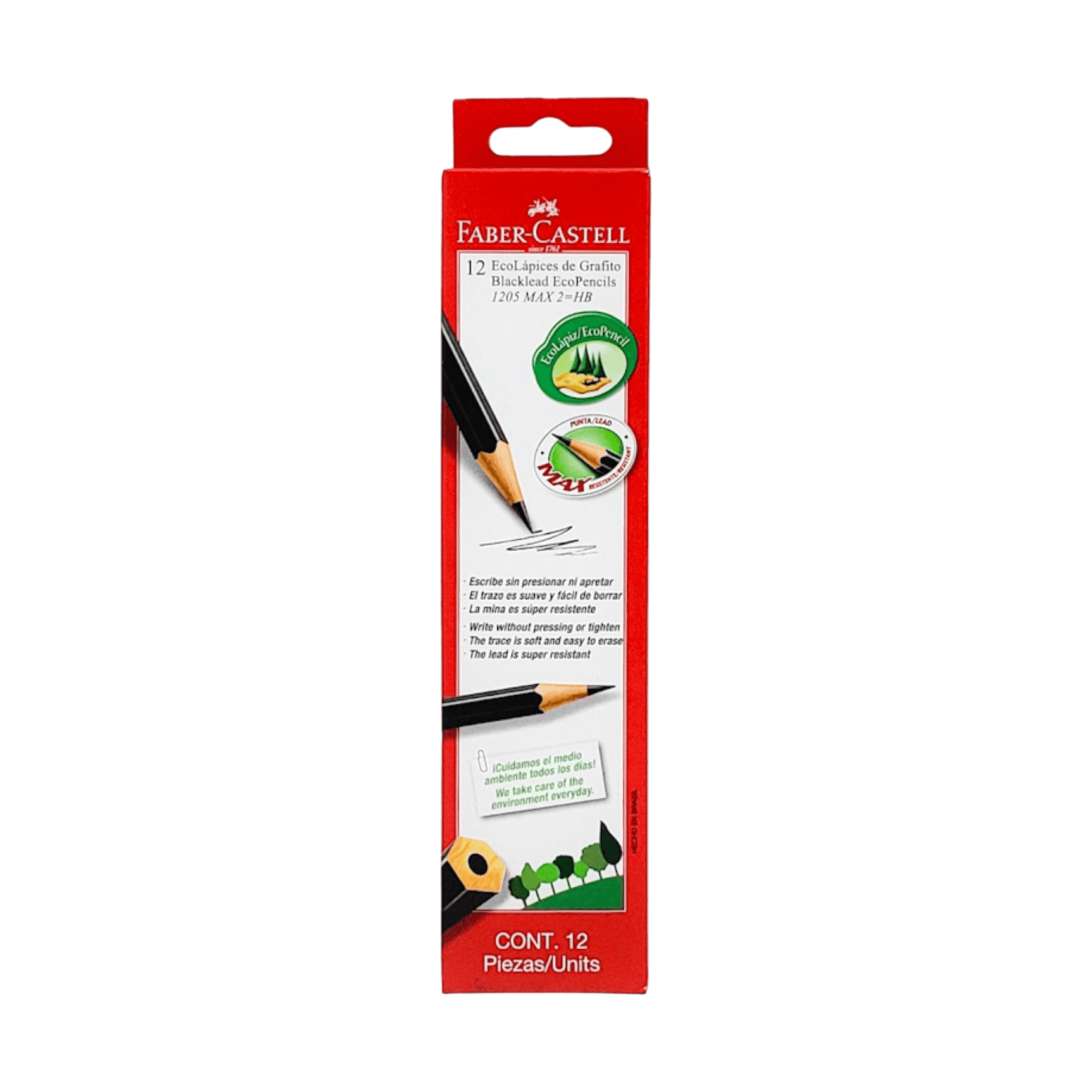 El Lápiz Grafito Faber Castell 1205 Ecolapiz HB Nº 2 es un instrumento de escritura y dibujo de alta calidad, ideal para uso escolar, profesional o personal. Este lápiz de grafito, con una graduación HB, proporciona trazos firmes y precisos, perfectos para bocetos, dibujos técnicos o simplemente para tomar notas.