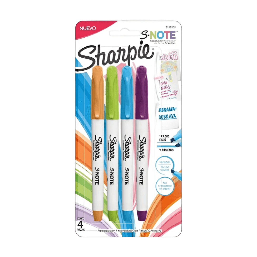Descubre los marcadores Sharpie Chisel, ideales para quienes buscan calidad y versatilidad en sus herramientas de escritura. Este set incluye cuatro marcadores en vibrantes colores, presentados en un práctico blister.