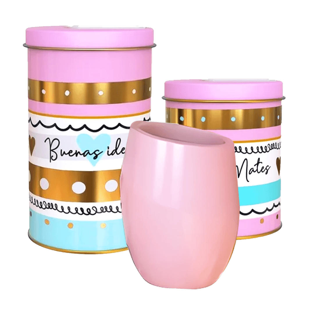 Este set incluye una yerbera y azucarera de hojalata con un práctico pico vertedor plástico, además de un mate de vidrio (tambien puede ser de plastico CONSULTAR).