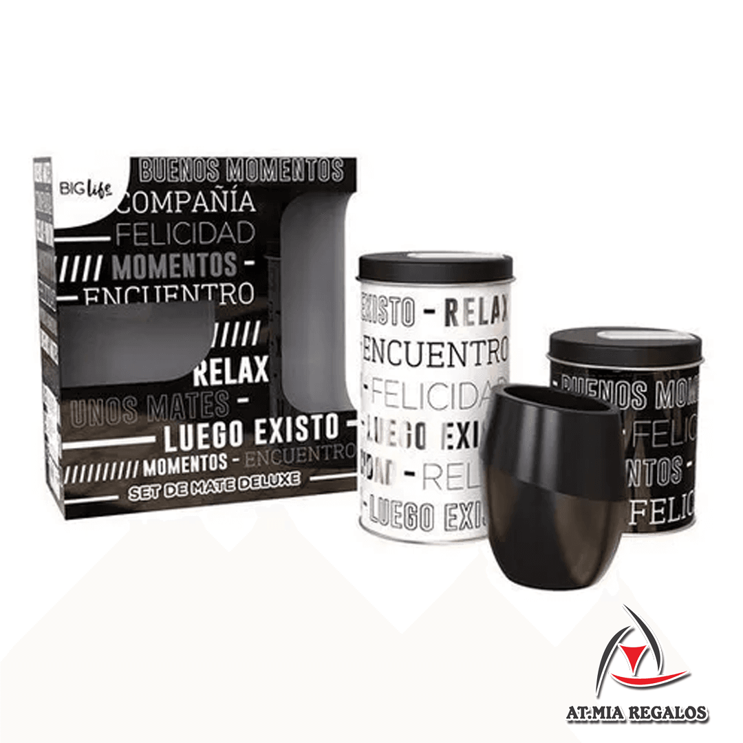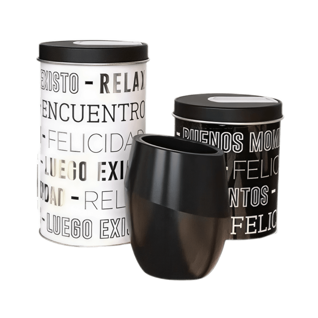 Este set incluye una yerbera y azucarera de hojalata con un práctico pico vertedor plástico, además de un mate de vidrio (tambien puede ser de plastico CONSULTAR).