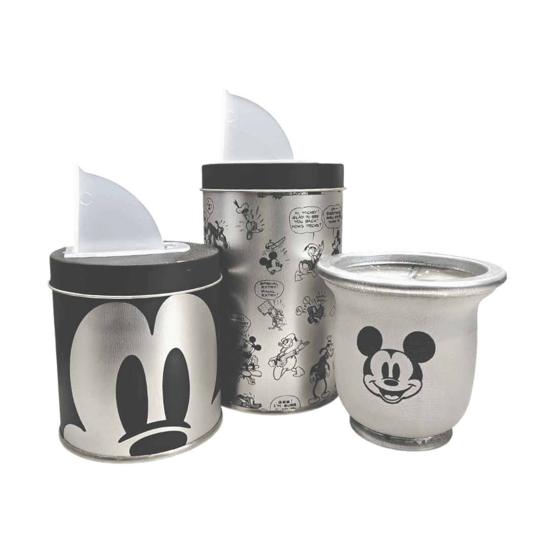 Un imprescindible para los fanáticos de la icónica serie! Este set incluye una yerbera y azucarera de hojalata con un práctico pico vertedor plástico, además de un mate de vidrio.