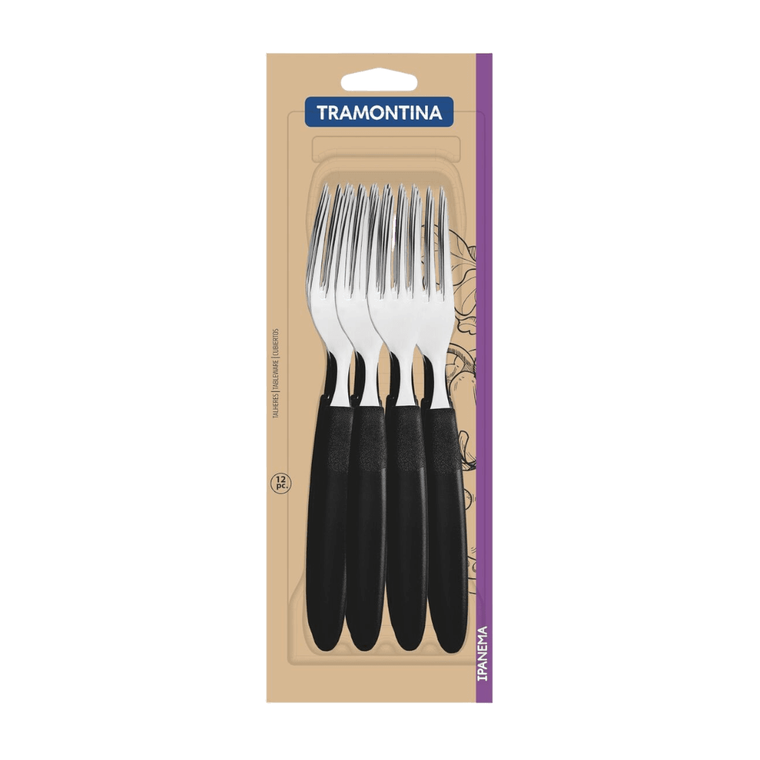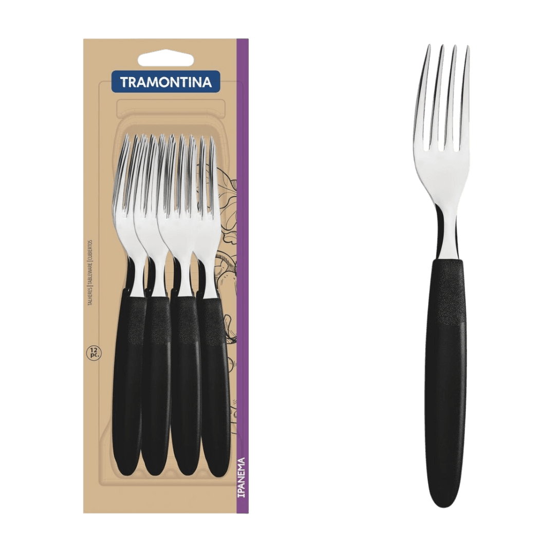 El Juego de Tenedores de Mesa Tramontina Ipanema con Láminas de Acero Inoxidable y Mangos de Polipropileno 12 Piezas va a completar tu cocina. Los tenedores que componen el juego tienen láminas de acero inoxidable con espesor que garantiza más resistencia y durabilidad, además de hacer que su utilización sea más práctica y tranquila. Sus mangos son de polipropileno negro y proporcionan un manejo cómodo y seguro, además de dejar tu mesa mucho más bonita, porque combina con diversos estilos de composición. Además, son muy fáciles de limpiar y pueden llevarse al lavavajillas, facilitando tu rutina en la cocina. Un juego perfecto para llevar elegancia y modernidad a tu mesa.