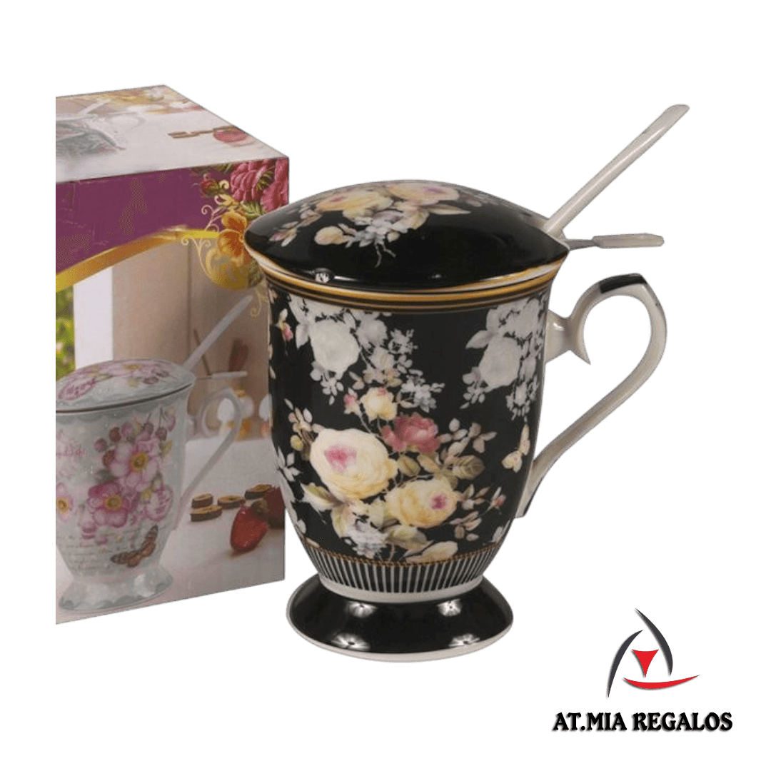 Taza de Cerámica c/Tapa y Cuchara Diseño Flores Negro 300ml