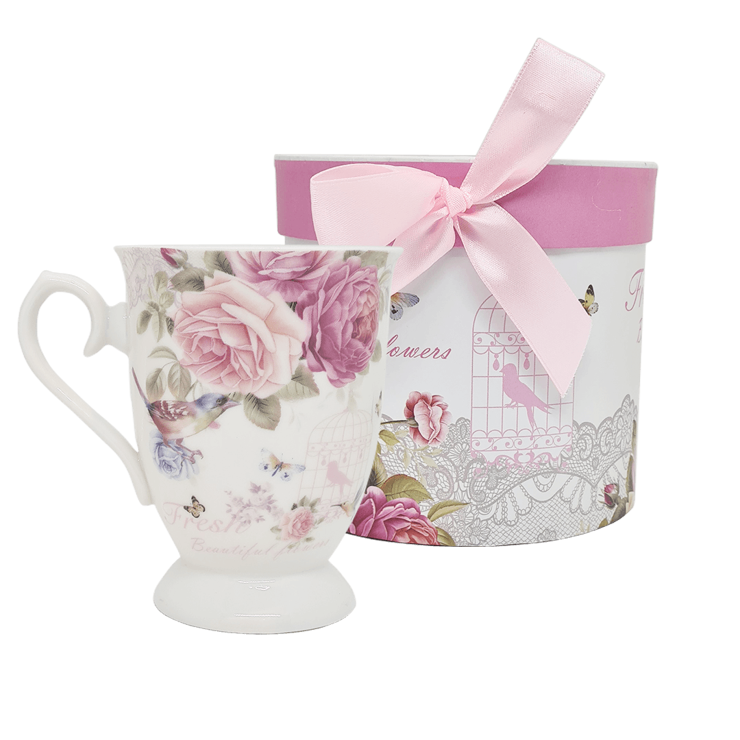 Taza de ceramica con decoraciones florales, viene con un estuche con moño.