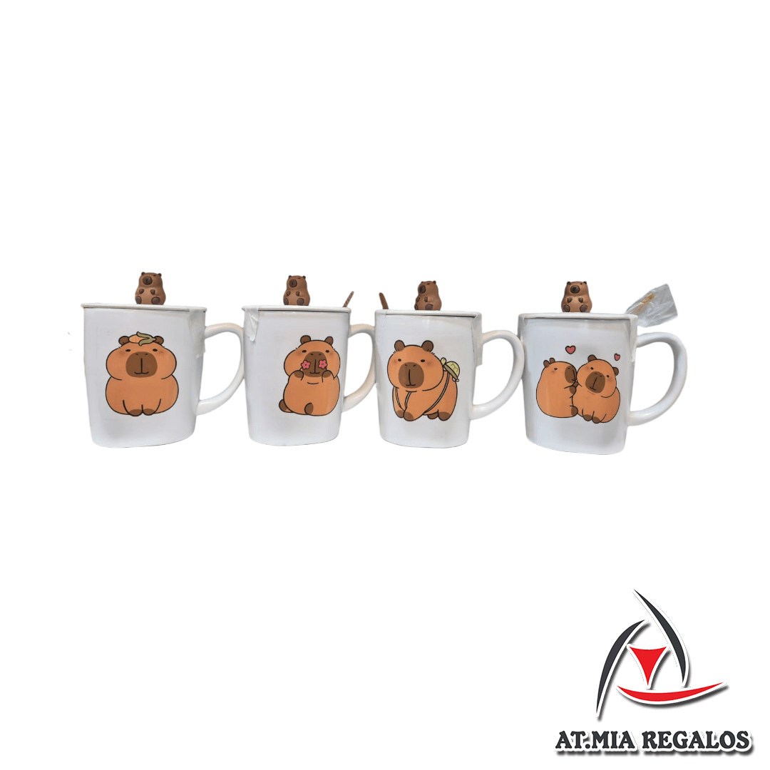 Taza de Cerámica Con Tapa + Cuchara Diseño Capibara 350ml
