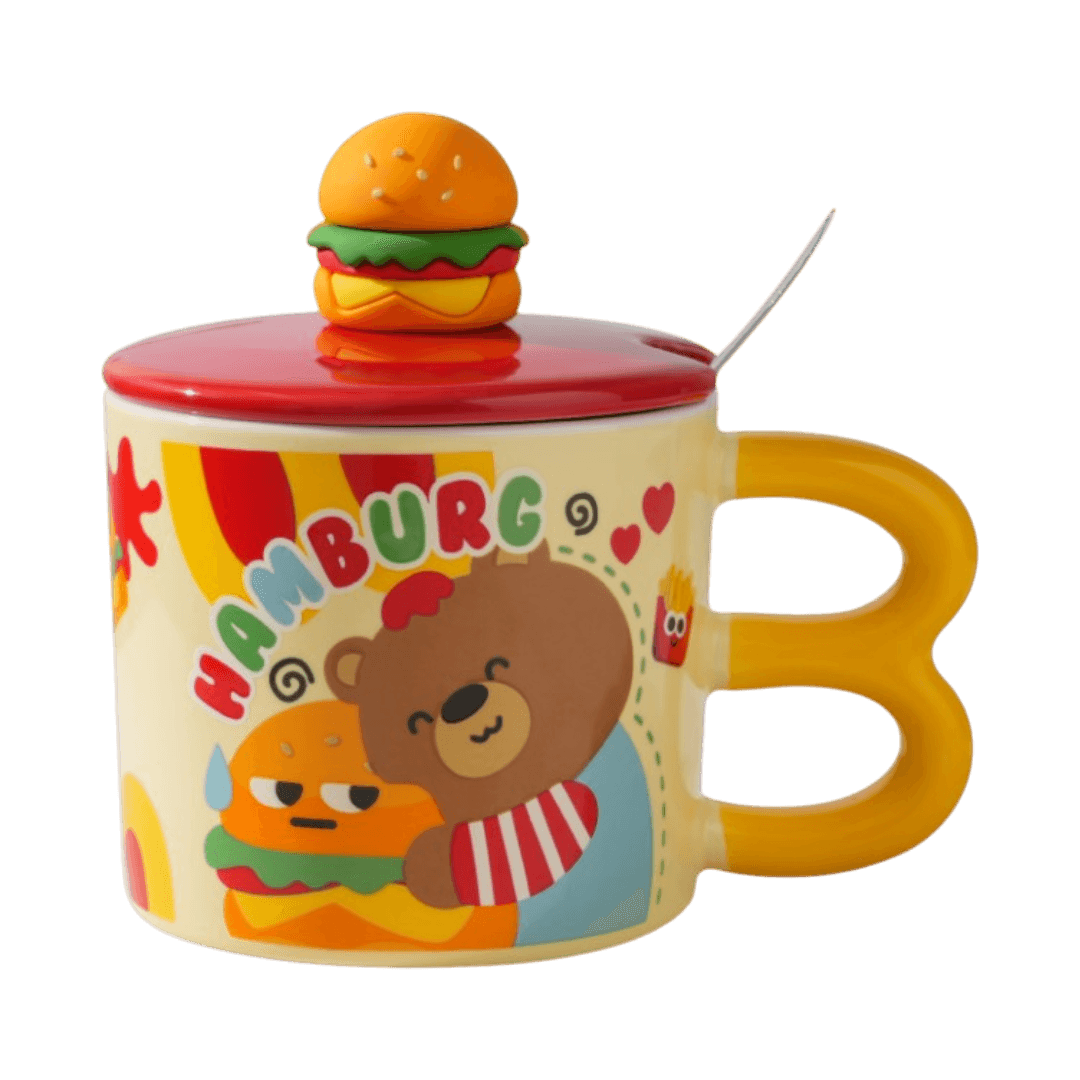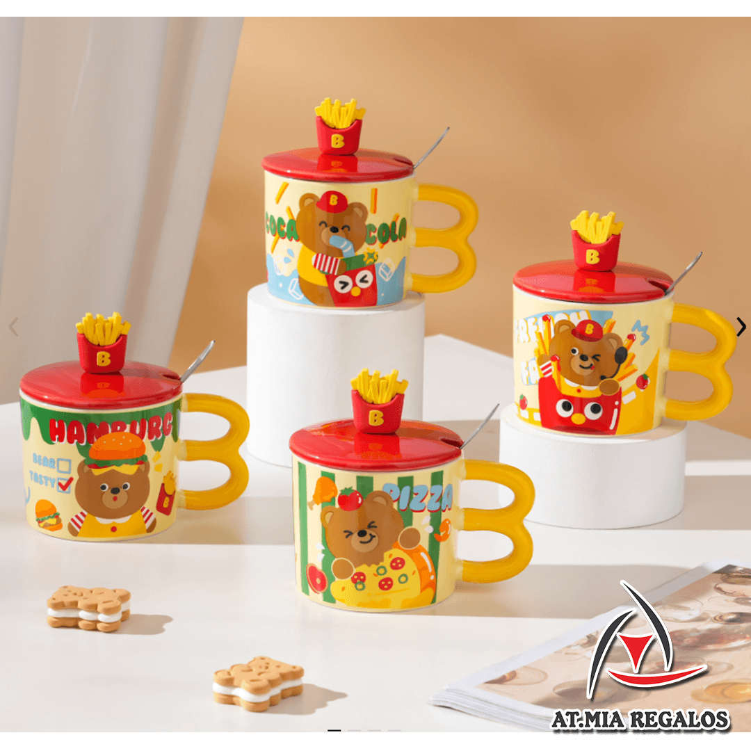 Taza de Cerámica Con Tapa + Cuchara Diseño Papa Frita 350ml