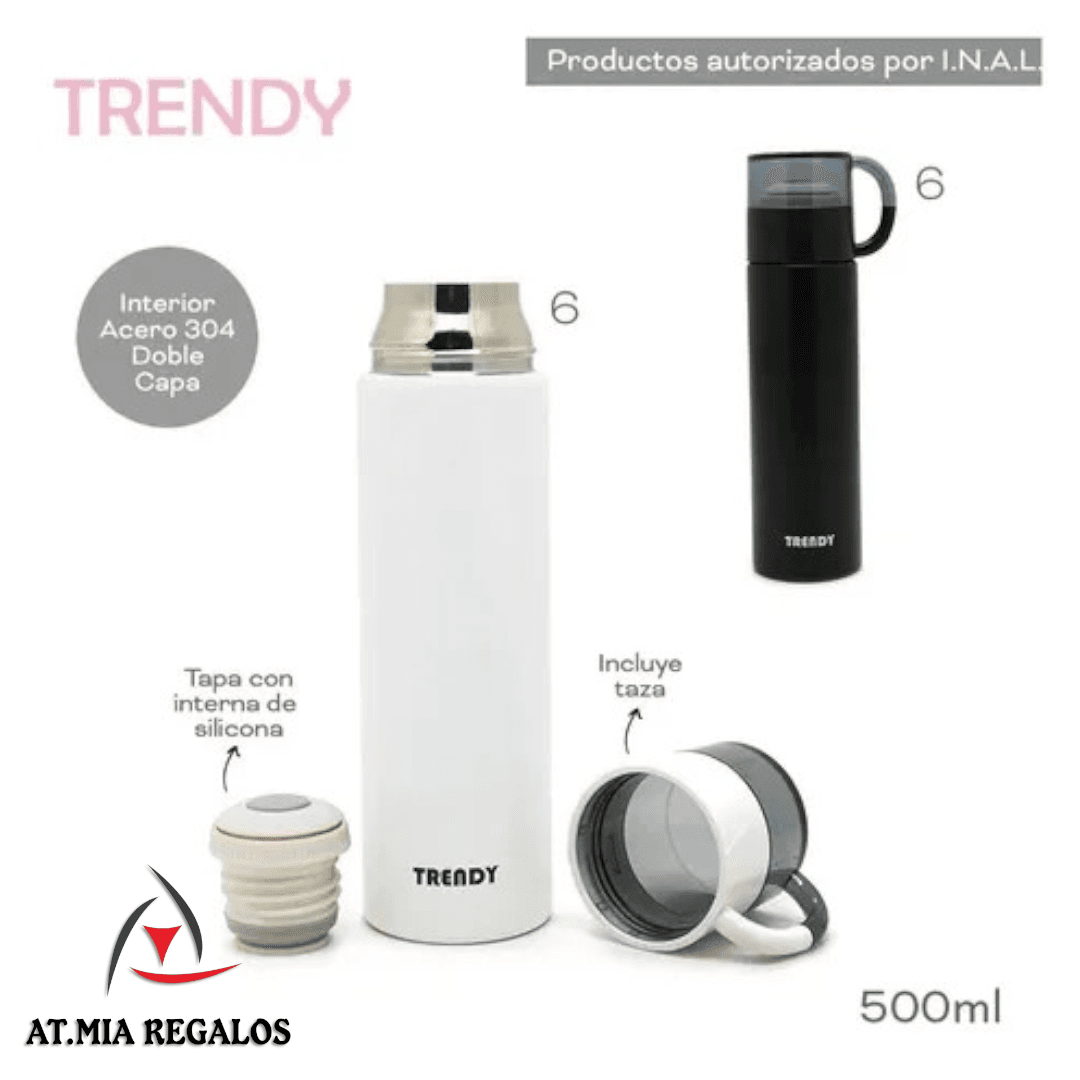 Termo Trendy , de capacidad 500 ml. Con capa Interna 100% de Acero Inoxidable AISI 304 y capa externa de acero inoxidable AISI 201 Tapa 100% de acero inoxidable AISI 201 con capa interna de polipropileno, burlete de silicona color transparente.