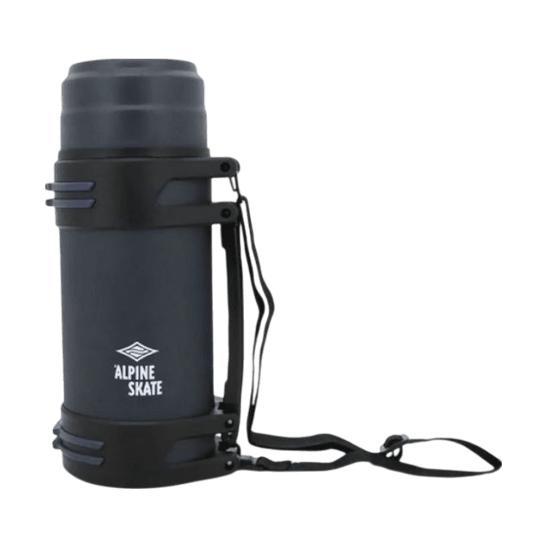 Termo Alpine Skate , de capacidad 1600 ml. Con capa Interna 100% de Acero Inoxidable AISI 304 y capa externa de acero inoxidable AISI 201. Agarradera de plastico color negro. Tapon a rosca 100% de polipropileno con burlete de color gris 100% de silicona. Tapon de tapa 100% polipropileno. Tapa externa e interna 100% de polipropileno. Con tira de color negro 100% de poliester.