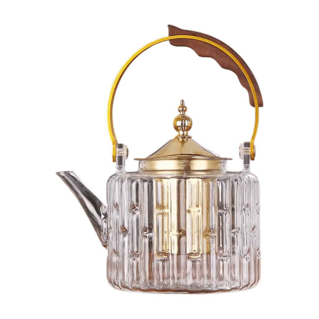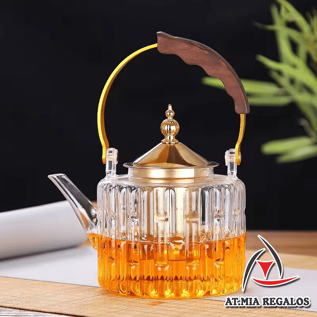 Tetera de Vidrio 1L c/Filtro Infusor Cónico Dorado Mango Madera