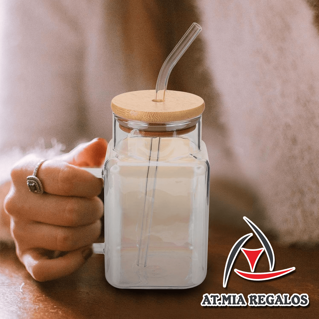 Vaso de Vidrio Con Tapa Bambú + Sorbete 620ml