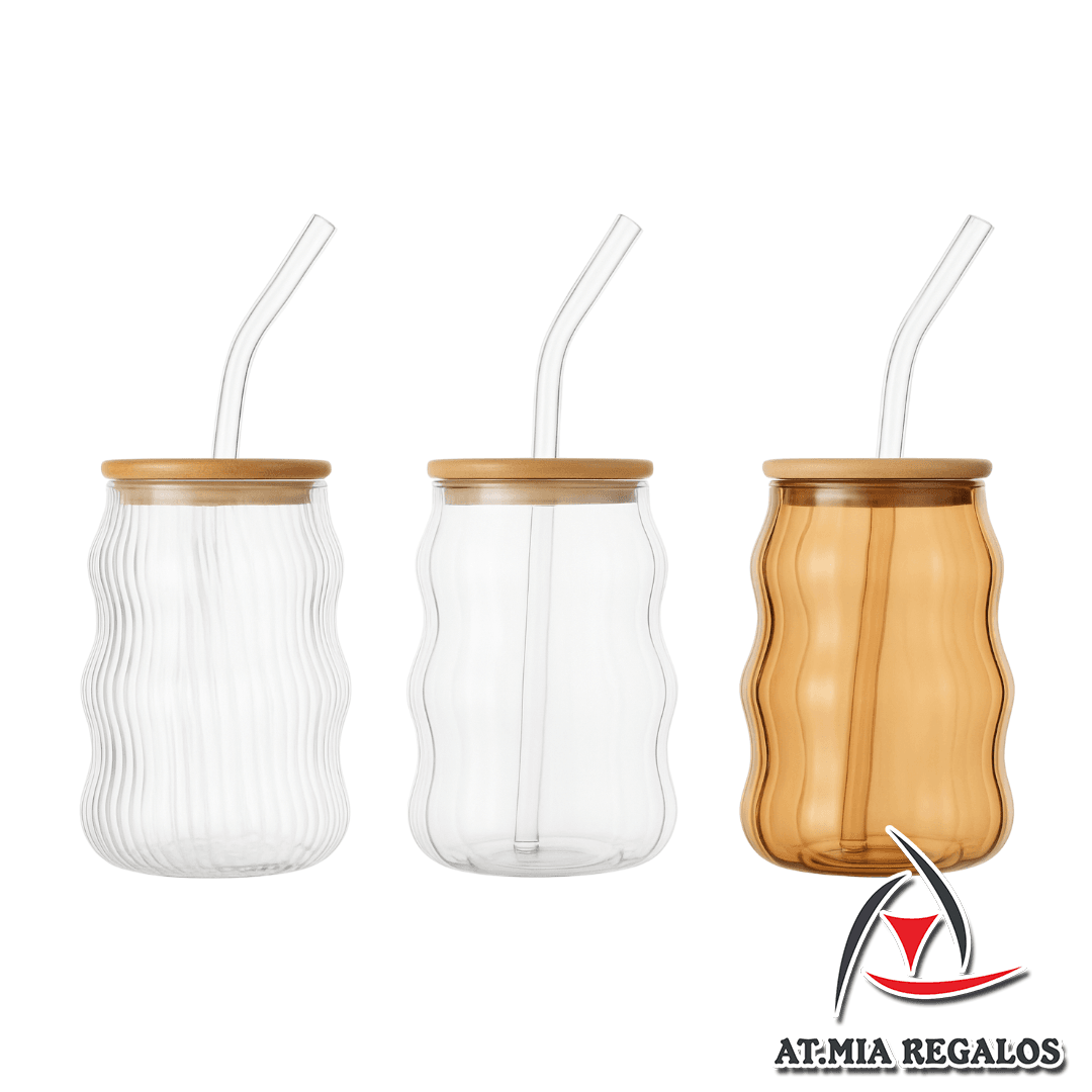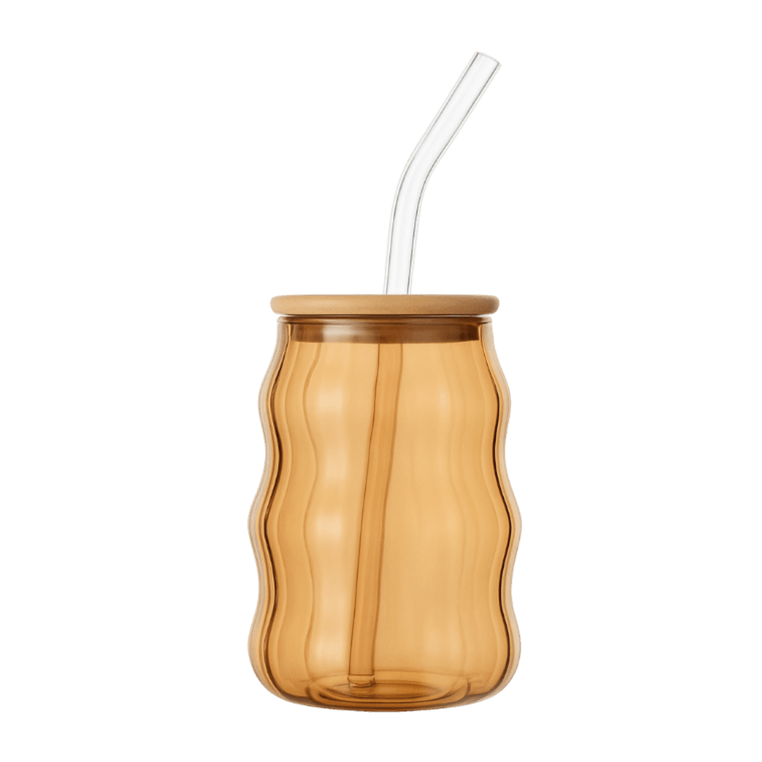 Vaso de Vidrio Con Tapa Bambú + Sorbete Acanalado Ondas Ámbar 450ml