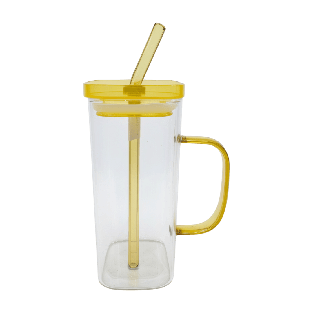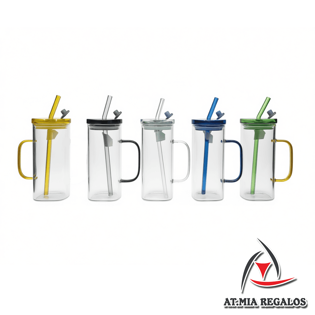 Vaso de Vidrio Con Tapa Bambú + Sorbete Cuadrada Colores Surtidos 400ml