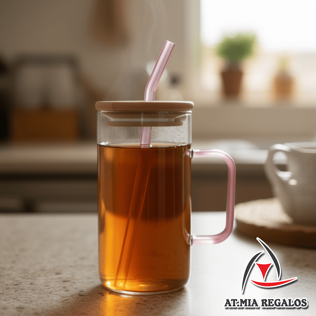 Vaso de Vidrio Con Tapa Bambú + Sorbete Rosa 400ml